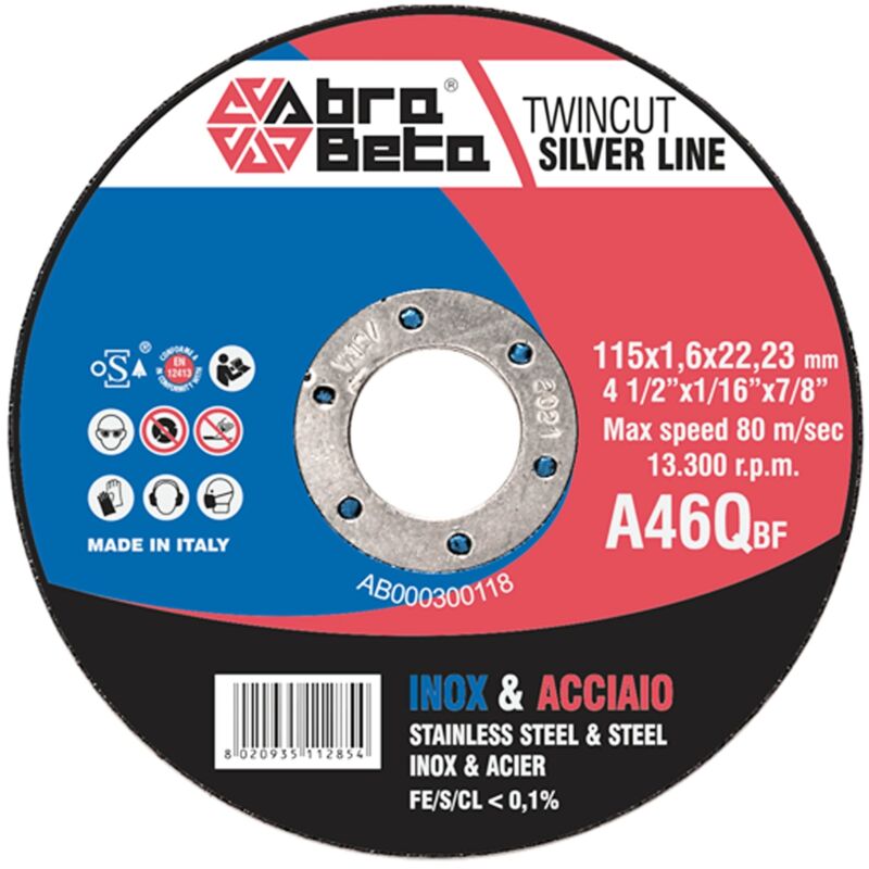 Disco da taglio Beta A36Q, di spessore sottile. Utilizzabili universalmente per il taglio di acciai inossidabili, acciai legati ed acciai trattati e non. VELOCITÁ DI TAGLIO DURATA UTILIZZO CONSIGLIATO ▣▣▣▣▢ ▣▣▣▢▢ SPECIFICHE PRINCIPALI Diametro Ø 115 Foro 22.23 Max RPM 13300