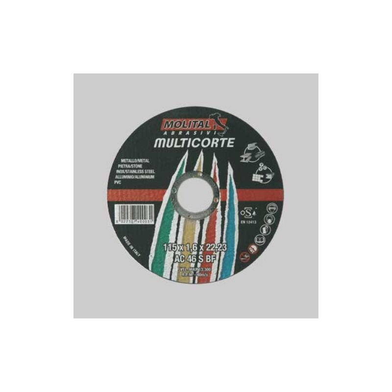 A centro piano. Foro mm.22. Per il taglio di inox, ferro-acciaio, alluminio, ghisa, marmo-pietra, granito, PVC. Disco da taglio universale ø 115x1,6 mm MOLITAL Dischi