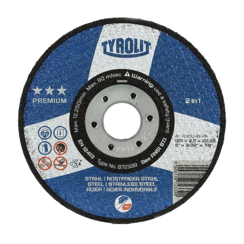 Disco per troncatura aggressivo (grado di durezza Q ridotto) per impiego universale su INOX e acciaio con durata e stabilità elevate. Uso: Per la troncatura a mano su smerigliatrici angolari elettriche e ad aria compressa con velocità di taglio vc di 80 m/s. Specifica: A30Q-BFXA. Nota: Lo spessore dei dischi deve essere pari ad almeno il 20% dello spessore del materiale da troncare. Dati tecnici a secco idoneo Acciaio < 60 HRC m/s idoneo Acciaio < 1400 N/mm² m/s idoneo GG(G) m/s limitatamente adatto INOX m/s limitatamente adatto Acciaio < 900 N/mm² m/s idoneo Ti m/s limitatamente adatto Acciaio < 67 HRC m/s idoneo Alluminio, CFRP m/s limitatamente adatto Acciaio < 55 HRC m/s idoneo Percentuale di ferro, zolfo e cloro % < 0,1 Angolo di registrazione consigliato Grad 90 Velocità periferica massima m/s 80 Sigla materiale abrasivo A Tipo di prodotto Disco per troncatura ⌀ Foro, mm 22,23 Numero massimo giri, min-1 8.500 Specifica A30Q-BFXA Larghezza disco, mm 2,5 Per spessori materiale