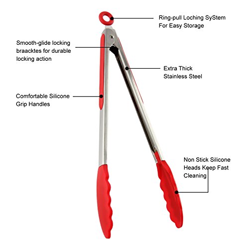 Discoball Pinze in Silicone Premium da Cucina Set-2 Pile in Silicone Antiscivolo Resistenti al Calore (9"e 12") con Manico in Acciaio Inossidabile - (Rosso)