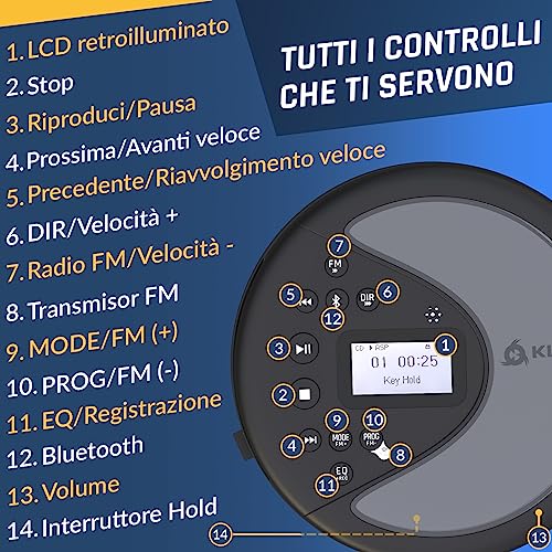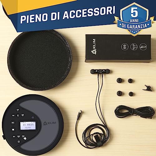 KLIM Discover + Lettore CD HiFi portatile + NUOVO 2023 + Cuffie incluse + Radio FM + Compatibile con MP3 CD Audiolibri + Lettore CD per auto + Supporta Bluetooth per Auto, scheda SD, Trasmettitore FM