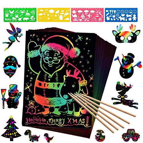 Disegni Scratch Art per Bambini, KY-Tech 50 Fogli Arcobaleno da Grattare Set Artistico Creativo Scarabocchiare con 12 Righelli da Disegno e 5 Puntine in Legno per Disegnare per Appunti Disegni Giochi