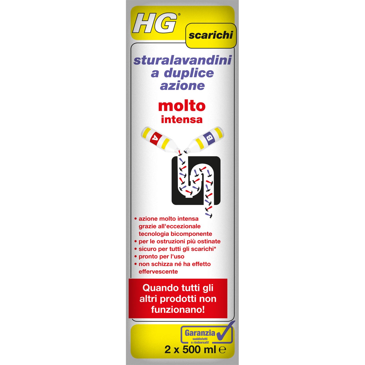 Prodotto bicomponente pronto all'uso indicato sia per scarichi sanitari che per scarichi della cucina.Non contiene acido solforico quindi non provoca esalazioni tossiche, non schizza e non ossida I metalli. Prodotto estremamente potente, da utilizzare quando altri disotturanti non hanno funzionato. Disocclusione degli scarichi sia sanitari che della cucina. estremamente efficace sia su scarichi sanitari che su quelli della cucina. Non contiene acido solforico. Non emette esalazioni nocive, non schizza, non puzza