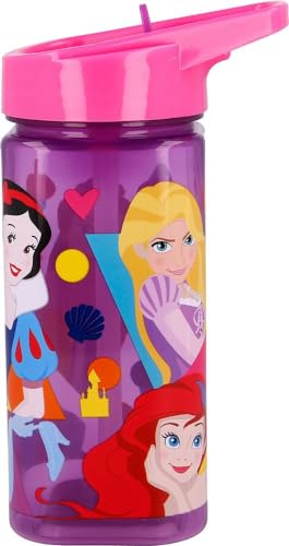 Disney Borraccia viola per bambine in plastica Principesse Ariel Rapunzel Belle Jasmine Biancaneve Cenerentola 530 ml con cannuccia che previene le perdite