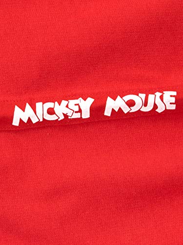 La maglia a mezza manica rossa e bianca vede ritratto il topolino più amato di tutti i tempi, Mickey con i suoi pantaloncini rossi, guanti e scarpe gialle su uno sfondo con strisce colorate.