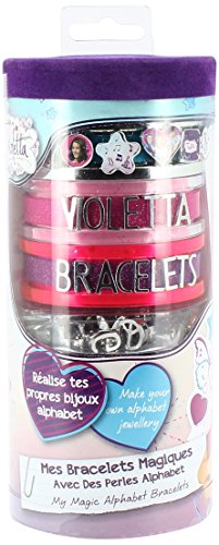 Contiene: 3 braccialetti in plastica dura, 5 braccialetti in plastica morbida, lettere, perline con adesivi Violetta.