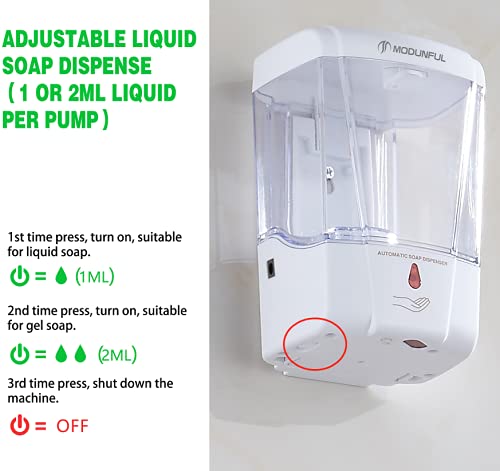 Dispenser di sapone liquido regolabile - 1 o 2 ml di liquido per . Funzionamento con un solo pulsante. Premere la prima volta, accendere, adatto per sapone liquido. Premere la seconda volta, accendere, adatto per sapone gel. Premere la terza volta, spegnere la macchina.
