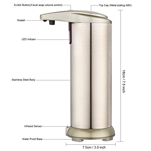 Durable & Safety: Realizzato con acciaio inossidabile spazzolato di nickel, utilizzando la tecnologia anti-perdita a livello AAA per evitare che i saponi o l'acqua corrodano componenti elettronici. Il design impermeabile della base è quello di evitare che il vano batterie sia imbevuto di acqua che potrebbe provocare corrosione e che il dispenser di sapone non funziona.