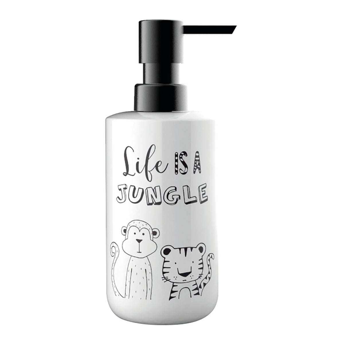 Jungle dispenser dosasapone in ceramica bianca con decalcomania di simpatici animali della giungla. arredamento fun, non convenzionale. una idea regalo originale per tutte le eta'.. pratico. adatto sia ad ambienti formali, dando un tocco di vivacita', che a tipologie di arredamento piu' informali. realizzato in ceramica facile da pulire
