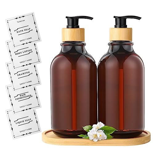 。◕‿◕。【Pratico set di Dispenser per Sapone】La confezione include 2 bottiglie di plastica BAP-free da 500ML, 2 pompe in bambù, 1 vassoio per sapone in bambù, shampoo e 5 etichette impermeabili (60 mm x 60 mm).