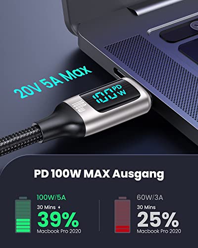 Cavo display LED: il cavo da USB-C a USB-C è dotato di chip E-mark integrato per supportare alta potenza e corrente (20 tensione/5 amp). Con il vantaggio del display digitale dei dati, questo cavo di ricarica veloce può mostrare lo stato di ricarica, siete pienamente informati della velocità di ricarica e sapere chiaramente che se il telefono è in ricarica rapida o meno.