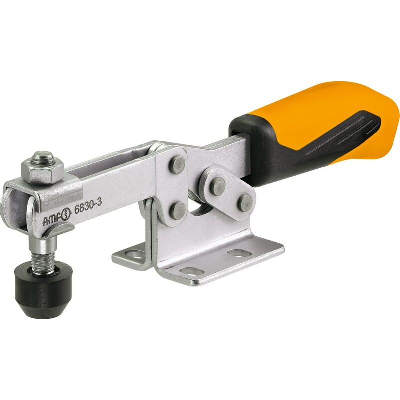 Sicurezza antisganciamento per viti di pressione. Struttura compatta grazie ad una nuova impugnatura. Impugnatura ergonomica bicomponente estremamente pratica grazie alla superficie più ampia. Con piede orizzontale per il fissaggio su piastre di montaggio, ecc. Uso: Per serrare e liberare rapidamente il pezzo nelle lavorazioni di serie o per l'impiego in dispositivi di serraggio speciali. Adatto per il serraggio per foratura, alesatura, rettifica, piegatura, saldatura, montaggio, ecc. Dati tecnici Tipo di prodotto Dispositivi di fissaggio Lunghezza complessiva, mm 206 Altezza di serraggio H, mm 32 Modello 6830J Altezza complessiva, mm 48,5 Distanza fori e, mm 25,7 Distanza fori f, mm 22-31,8 ⌀ Foro d, mm 6,5 Forza di tenuta P1, N 1.800 Forza di tenuta P2, N 2.500 Vite di pressione, mm M8×45