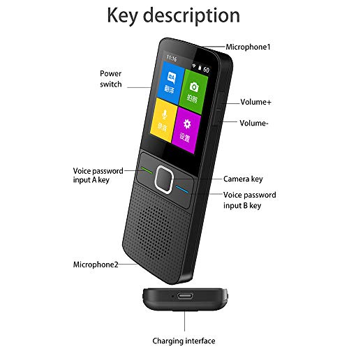 Traduttore di foto di testo vocale: il dispositivo traduttore di lingua adotta un design ultra-mini, ha un touch screen da 2,4". Quando si parla di ciò che si desidera tradurre, la traduzione verrà convertita in testo e visualizzata sullo schermo. Il dispositivo di traduzione T10 AI ha 5 milioni di pixel e fotocamera OCR (Character Recognition), che supporta 47 lingue per la traduzione fotografica. Le parole o le frasi straniere possono essere tradotte senza alcun altro input.