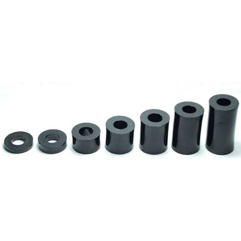 10 distanziali universali in plastica (nylon). Diametro interno 5mm, diametro esterno 10mm, per uso M5 (vite, tubo). Spessore 22 mm.