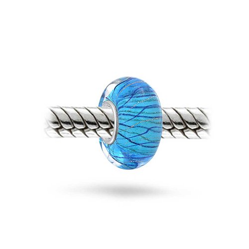 Distanziatore In Vetro Di Murano Perlina Charm A Strisce Blu Glitterata Adatta A Bracciale Europeo Per Donne Adolescenti .925 Nucleo In Argento Sterling