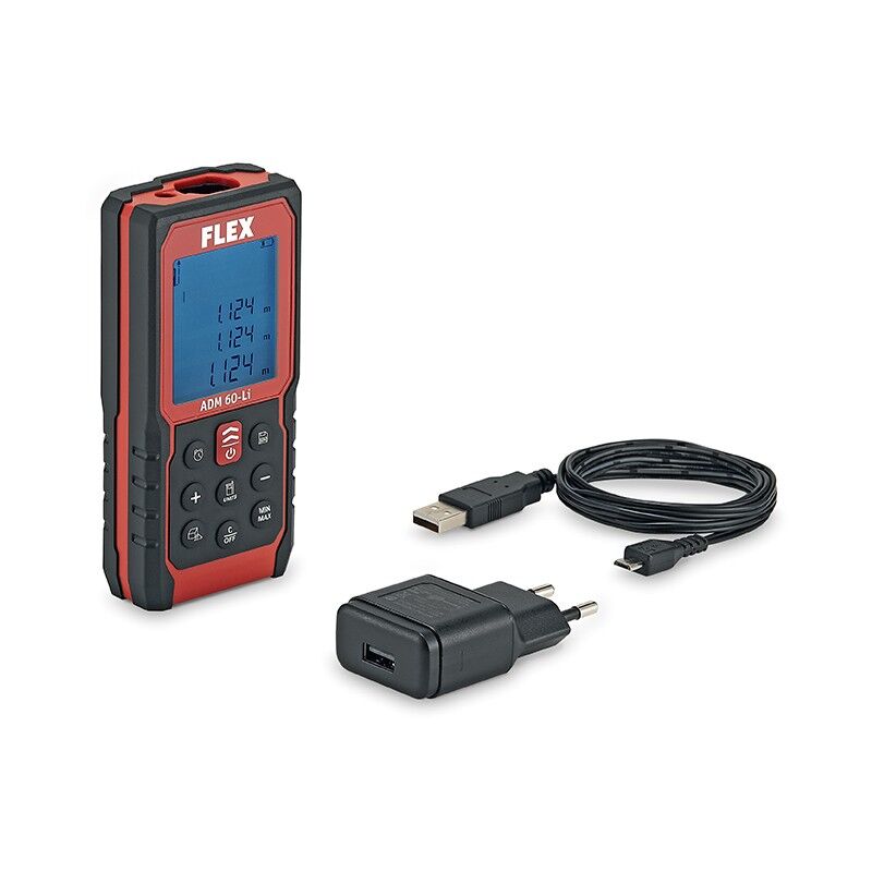 Flex Distanziometro Laser ADM 60 Li (447862) Misurazione rapida nei cantieri Calcolo di lunghezza, area e volume Determinazione di altezze con misurazione indiretta della distanza (Pitagora semplice e doppia) Funzione Painter, calcolo automatico della somma delle aree delle singole pareti con la stessa altezza Modalità di misura continua Misura commutabile in m/mm, pollici/piedi Ha 4 punti di riferimento Funzione minima/massima Spegnimento automatico Display illuminato a quattro righe Alloggiamento a prova di polvere e spruzzi Timer per misure su treppiede Filettatura di collegamento da ¼ per treppiedi Equipaggiamento di base 1 cavo USB 1 caricatore USB 1 borsa per il trasporto Specifiche tecniche: Batteria integrata = 3,7 V 500 mAh / Li-Ion Dimensioni (L x P x A) = 30 x 56,5 x 122 mm Peso = 0,13 kg Precisione = ± 3 mm Max. Campo di lavoro = 0,15 - 60 m Classe laser = 2 Diodi laser visibili = < 1 mW, 635 nm