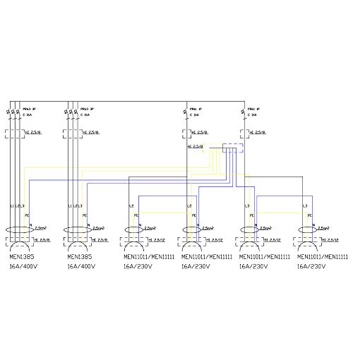 Dotazione: 4 prese Schuko Mennekes da 230 V, 16 A, IP54, 2 prese 16 A, 5 P, 400 V, CEE Mennekes, IP44