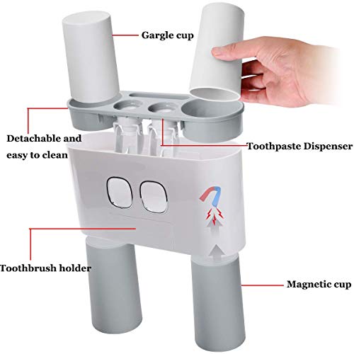 FXY Set di distributore di dentifricio e portaspazzolino, dispositivo che spreme automaticamente il dentifricio, con 5 supporti per spazzolino e 4 tazze Grigio
