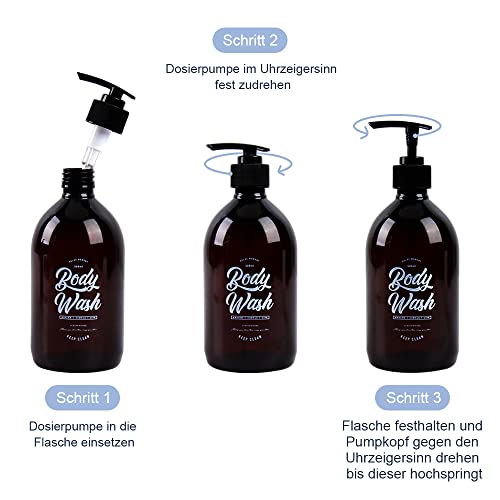 Ricaricabile: i 2 flaconi di plastica hanno un volume di 500 ml e sono adatti per prodotti liquidi per la cura della pelle come shampoo, balsami e lozioni. La bottiglia a pompa è riciclabile al 100%.