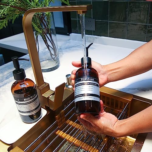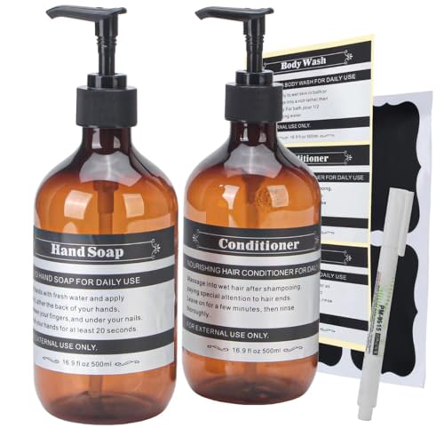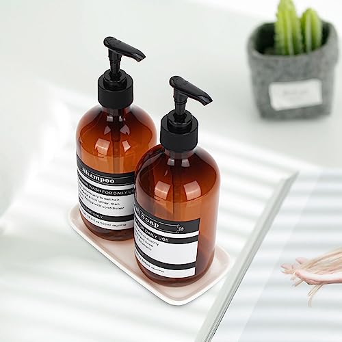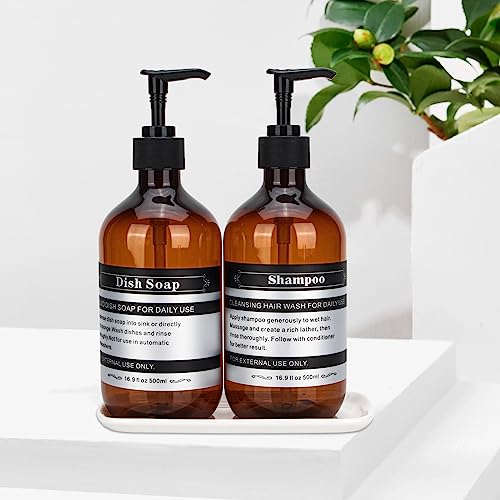 Set di 2 distributori sapone plastica con pompa e vassoio ceramica - Ricaricabili per sapone liquido, detergente piatti, bagnoschiuma, shampoo - Etichette impermeabili - 500ml (Ambra)