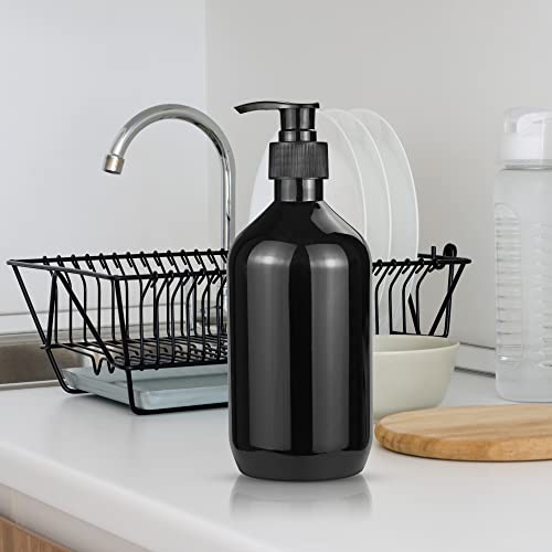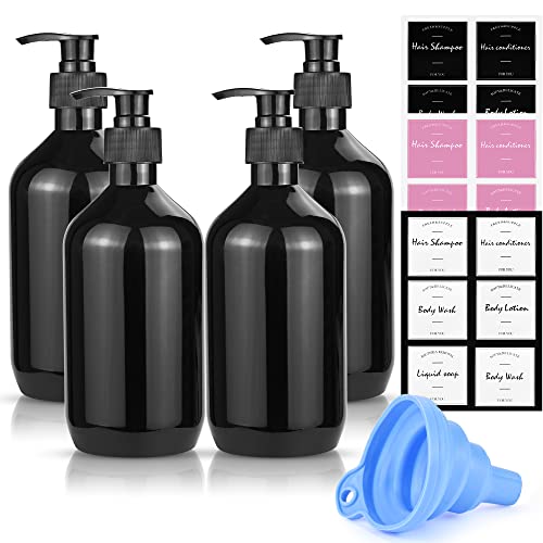 Set di 4 distributori di sapone da 500 ml, ricaricabili, con etichetta e imbuto, in plastica PET, dispenser di sapone in plastica, dispenser per lozioni, colore nero, per bagno e cucina