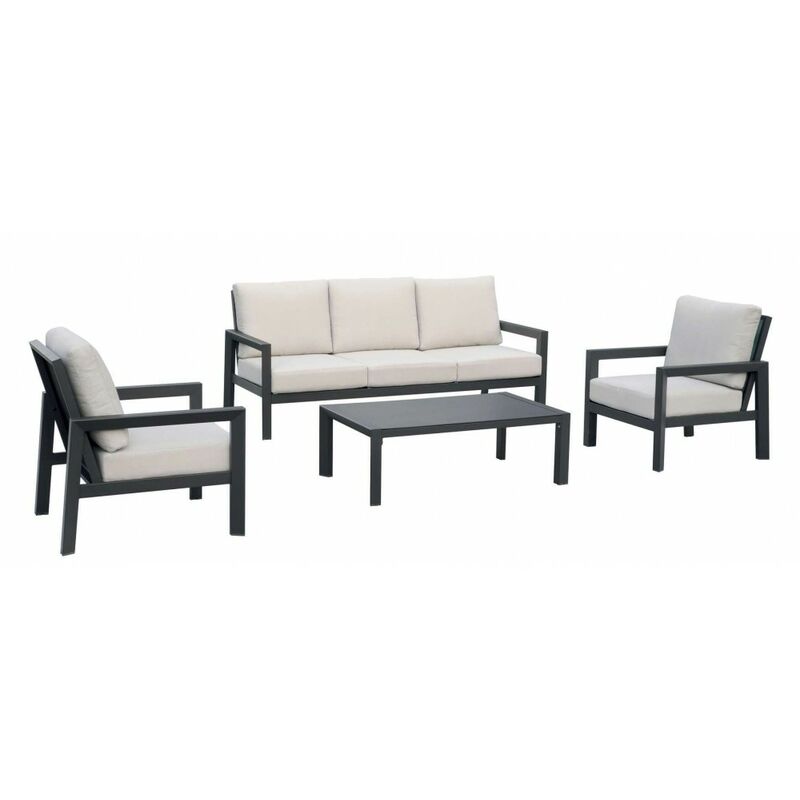 Set Divani Giardino antracite Nizza Questo modello di divani per esterni è ideale per ricreare un piccolo salotto all"aperto, a bordo piscina o in giardino. E" comodo, elegante e dal design ultra moderno per garantire un aspetto sofisticato e confortevole nello stesso tempo. Il set è dotato di due poltrone, un divano e un tavolino. Colore antracite . Descrizione prodotto: struttura in alluminio antracite cuscini sfoderabili colore grigio chiaro 2 poltrone 1 divano a tre posti 1 tavolino con piano in alluminio viteria in acciaio inossidabile