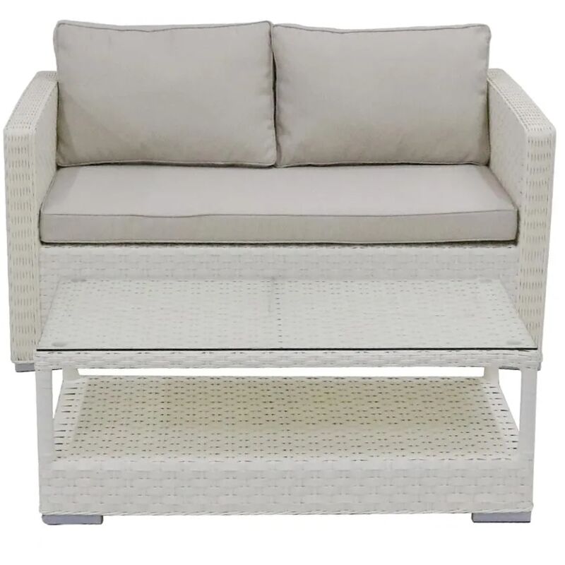 Divano da giardino Kioss effetto vimini con cuscineria sfoderabile. Disponibili i seguenti elementi: divano 2 posti tavolino Il tutto in tessuto idrorepellente sfoderabile e resistente agli agenti naturali Possibilità di composizioni parziali e personalizzate.