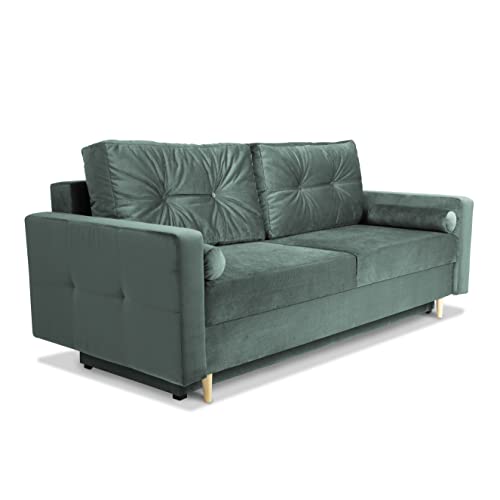 Divano letto 3 posti 215x70 cm verde - con contenitore per la biancheria da letto, 2 cuscini, velluto - divano a 3 posti, divani da soggiorno, divano letto matrimoniale