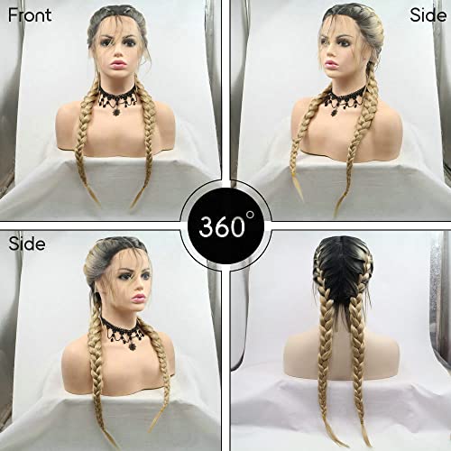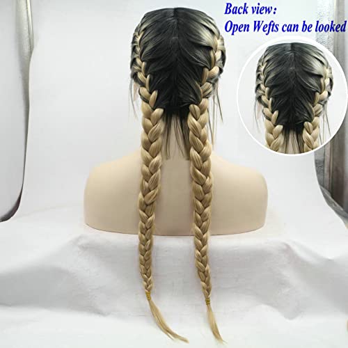 Divisione centrale Doublu donna trecce Blonde synthetic Lace Front Wigs for party Cosplay/2 x Twist Braids Long Dark Roots ombre Blonde Half Hand Tied Heat Resistant Fiber treccine