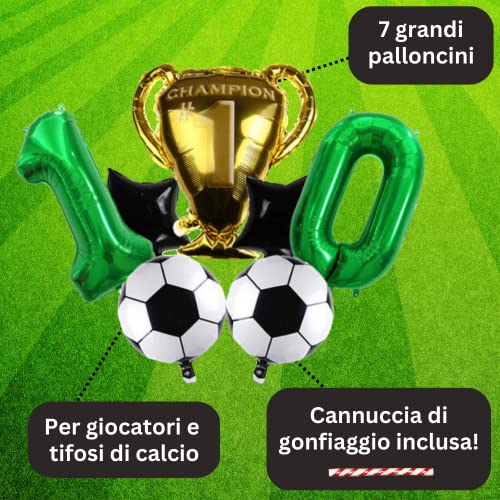 COMPLEANNO CALCIO 10 ANNI PALLONCINI SET: 1x palloncini XL numero 10 verde (circa 70 cm, non vola con l'elio), 1x palloncino oro coppa campione #1 in foil (circa 70 x 60 cm, non vola con l'elio), 2x palloncino calcio (circa 45 cm), 2x palloncino stella nera. (circa 45 cm)