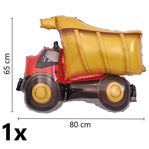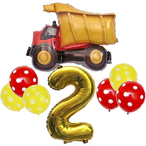 DECORAZIONI PER FESTA DI COMPLEANNO CON ESCAVATORE 2 ANNI: 1x gigantesco palloncino dorato con il numero 2 (circa 90 cm), 1x palloncino XL con escavatore (circa 80 x 65 cm), 3x palloncino in lattice rosso (circa 30 cm), 3x palloncino in lattice giallo (circa 30 cm)