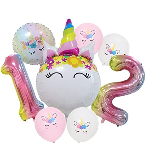 DECORAZIONI DI COMPLEANNO UNICORNO 12 ANNI: 1x palloncino XL numero 12 (circa 70 cm), 1x palloncino XL unicorno (circa 50 x 80 cm), 1x palloncino di alluminio unicorno (circa 45 cm), 2x palloncino di lattice unicorno rosa (circa 30 cm), 2x palloncino di lattice unicorno bianco (circa 30 cm)