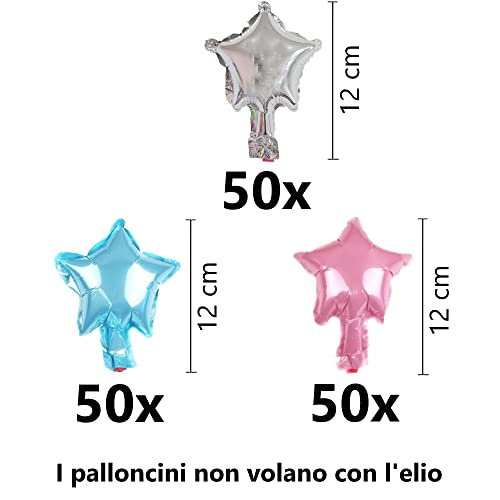 GRANDE SET DA 150 PEZZI: 150 incantevoli mini palloncini a stella (circa 12 cm ciascuno, i palloncini NON volano con elio), 50x Argento, 50x Blu, 50x Rosa.