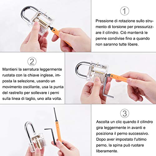 【Set completo perfetto】 26 pezzi di set di grimaldelli soddisfano i vari tipi di strumenti e accessori, tra cui 2 lucchetti trasparenti e 4 chiavi, 17 set di grimaldelli e 2 scatole di lucidi trasparenti, 1 borsa con cerniera 【Nota】 perché il set di grimaldelli è un prodotto che insegna a qualcuno a sbloccare e che può comportare azioni di furto, 【Amazon non ci consente di fornire istruzioni】 tuttavia ci sono molti video didattici su YouTube.