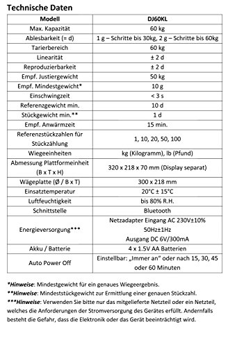 Bluetooth: la bilancia può essere collegata in modalità wireless con lo smartphone o il PC. Contenuto della confezione: 1 x bilancia DJ-KP (piattaforma, cavo + display), 1 x istruzioni in tedesco e inglese, 1 x alimentatore di rete, 1 x supporto a parete