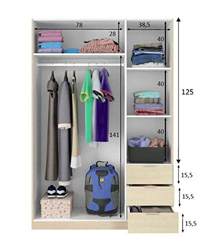 Dmora Armadio a Tre Ante con Barra Appendiabiti, Ripiani e cassetti, Color Rovere, Misure in cm 121 x 51 x h180, Small