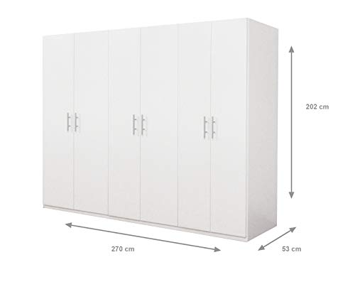 Dmora Armadio a 6 Ante battenti, Bianco Opaco,con Tubo Appendiabiti cm 207x 53 x h202