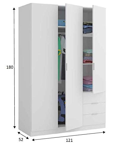 Dmora Armadio Ante e Tre cassetti con Ripiani e Barra Appendiabiti Colore Bianco, Misure in cm 121 x 51 x h180, Small