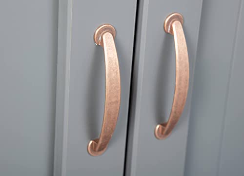 Mobile dalle linee semplici e moderne, abbellito dalle maniglie color rame che, oltre a facilitare l'apertura di ante e cassetti, donano al tutto un tocco di eleganza