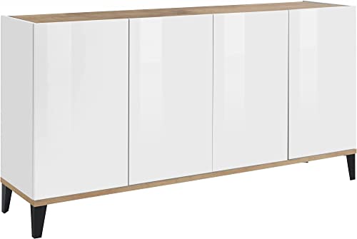 CREDENZA MODERNA: Credenza di design utilizzabile come mobile da soggiorno o buffet, credenza moderna con quattro ante - Interamente di colore bianco lucido e acero