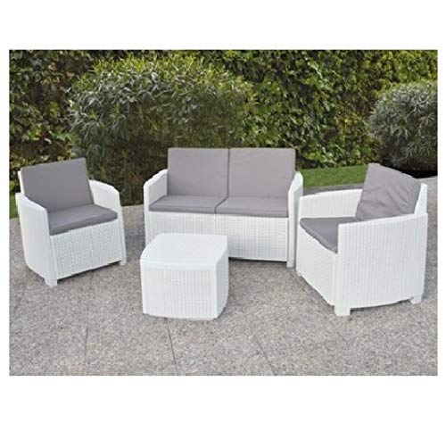 Dmora 0 Set da Giardino J con Cuscini, 1 Divano + 2 Poltrone (con braccioli) + 1 Tavolino Contenitore da Esterno, Made in Italy, Bianco