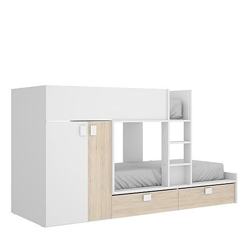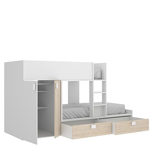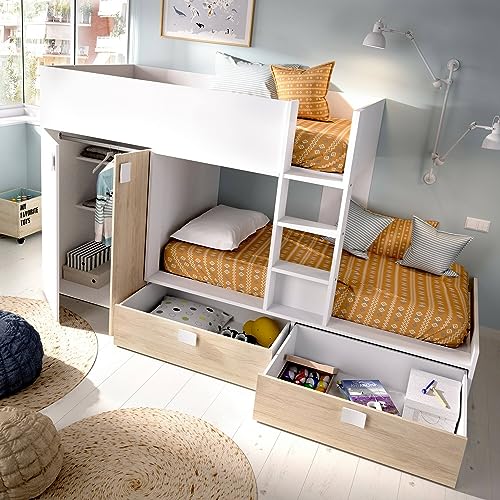 LETTO PER BAMBINI BREITHORN - Cameretta completa con armadio e cassetti, Composizione letto a castello con due lettini singoli, 275x108h150 cm, Bianco e Rovere