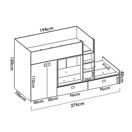 DIMENSIONI IN CM - Letto inferiore: Lunghezza: 194, Larghezza: 91, Altezza: 40 - Letto superiore: 194x102h38 - Armadio 80x102h112 - Cassetti: 96x91h26 - Scaletta: 33x14h124