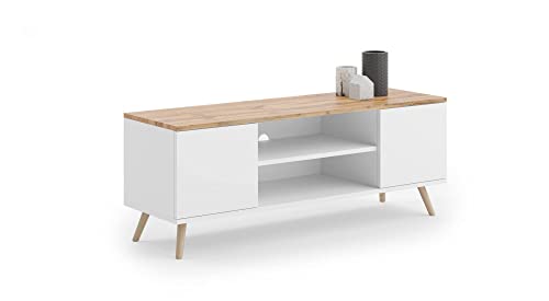 MOBILE PORTA TV -Mobile porta TV da salotto in stile scandi con due ante e un ripiano - Mobile porta TV, Colore bianco con top colore acero