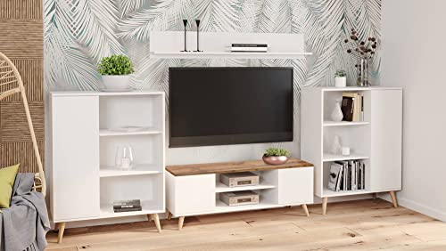 STRUTTURA E UTILIZZO -Mobile da soggiorno pratico e salvaspazio strutturato con due ante e un ripiano nella parte centrale - La struttura è rialzata da terra con quattro eleganti piedini in faggio che richiamano lo stile scandinavo - Ante e cassetti sono privi di maniglie entrambi dotati di forti cerniere/guide metalliche - Il ripiano superiore è perfetto per accogliere la vostra TV o i vostri soprammobili preferiti