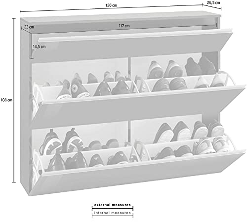 STRUTTURA E UTILIZZO: Pratica ed elegante, è la soluzione perfetta se collocata in un ambiente moderno, risulta molto capiente grazie alla struttura con tre ante a ribalta - Internamente le antine a ribalta presentano il vano con doppia capienza dove riporre le scarpe - L'anta superiore contenente solamente un vano a capienza singola - Antine dotate di forti e durevoli cerniere metalliche