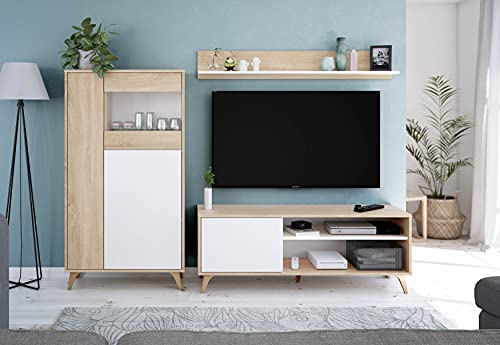 VETRINA ATLANTA - Vetrinetta moderna a 3 ante, Credenza da soggiorno o salotto, Madia alta con ripiani, cm 77x33h142, Rovere e Bianco
