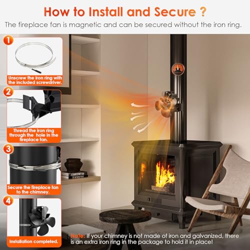 【2 modi per installare】Esistono due modi per installare il ventilatore per caminetto: il primo: utilizzare direttamente la funzione magnetica del prodotto stesso per fissarlo alla canna fumaria (nota: deve essere in ferro);