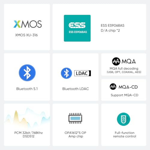 【Combinazione di chip di alta qualità 】 DO200 MKII utilizza 2 chip dac ES9068AS, THD+N a -122dB. 5 x OPA1612A di fascia alta a doppio funzionamento e XMOS XU316, supporta DOP256 e DSD512 nativi, PCM fino a 32bit/768kHz.