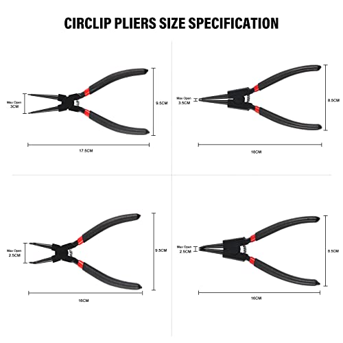 Materiali di alta qualità: il kit di pinze per anelli di sicurezza interni/esterni è realizzato in acciaio di alta qualità con elevata durezza e durata, la punta è rivestita di elettroforesi nera per prevenire la ruggine e durare a lungo.